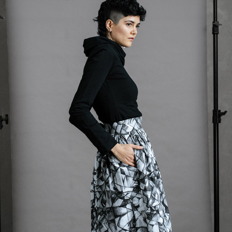Slow, Australian made Zero Waste skirts in timeless silhouettes and distinctive print. Slow design for conscious fashion and size-inclusive style (6-22). Ethical Clothing Australia accredited sustainable skirts that transition from day to evening, crafted with thoughtful design that reduces waste without compromising style.