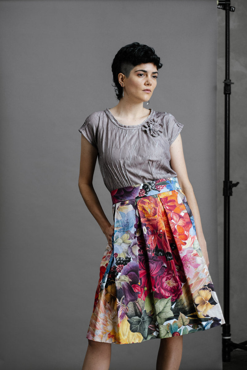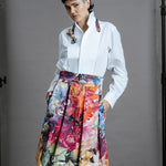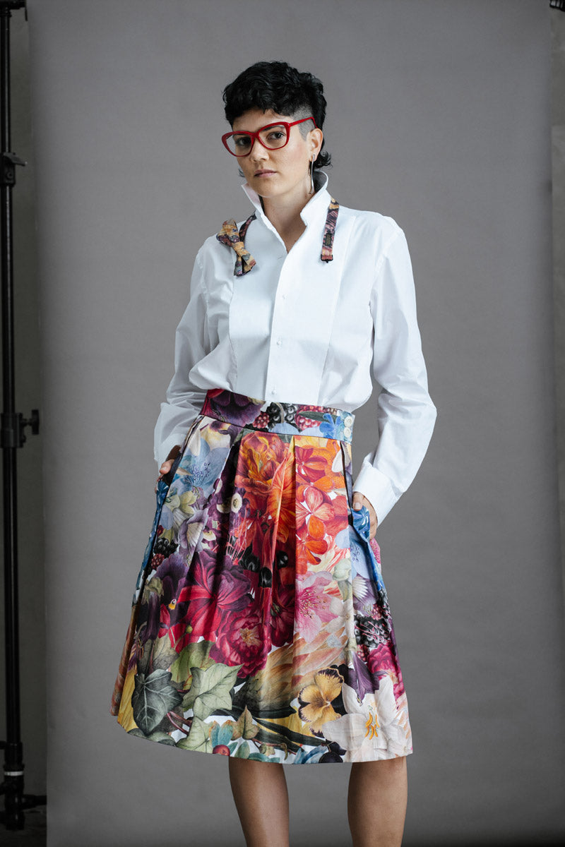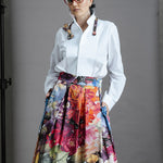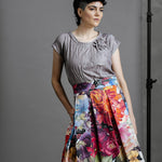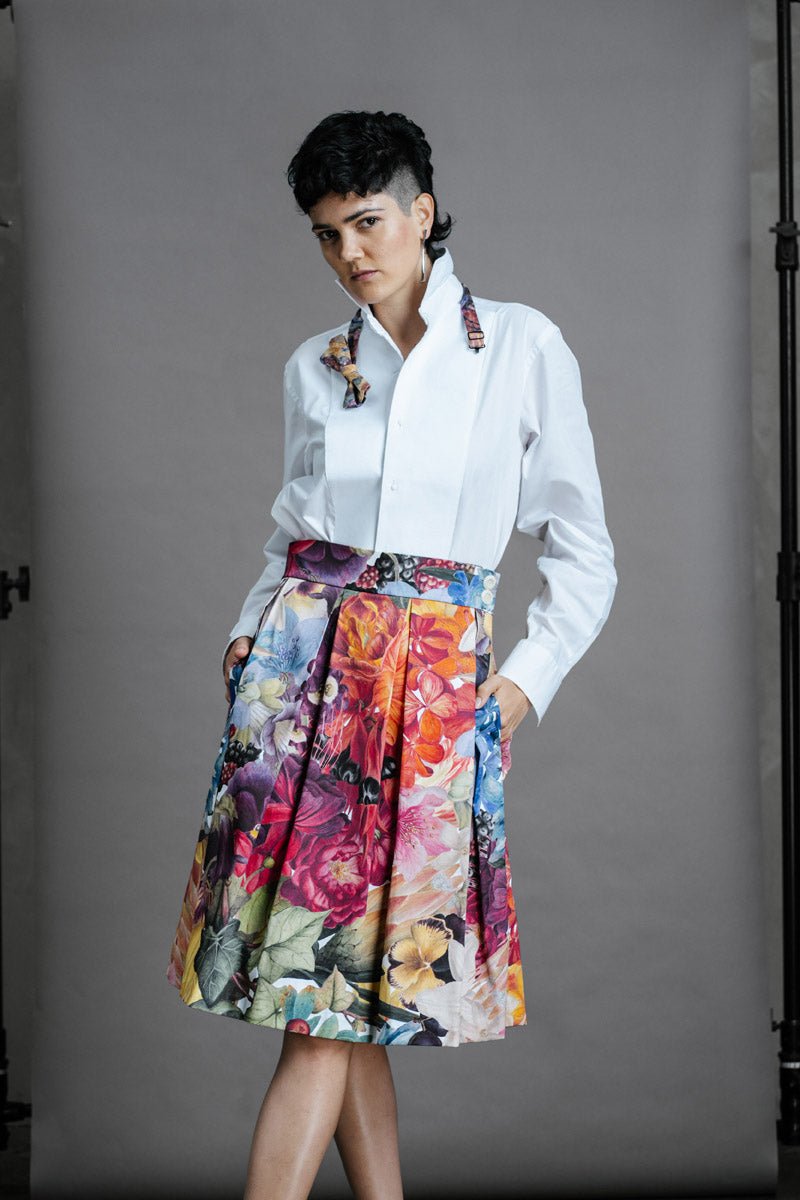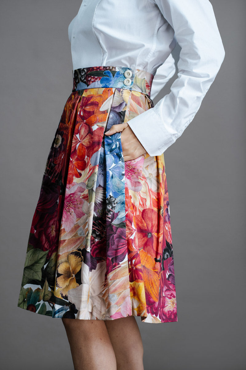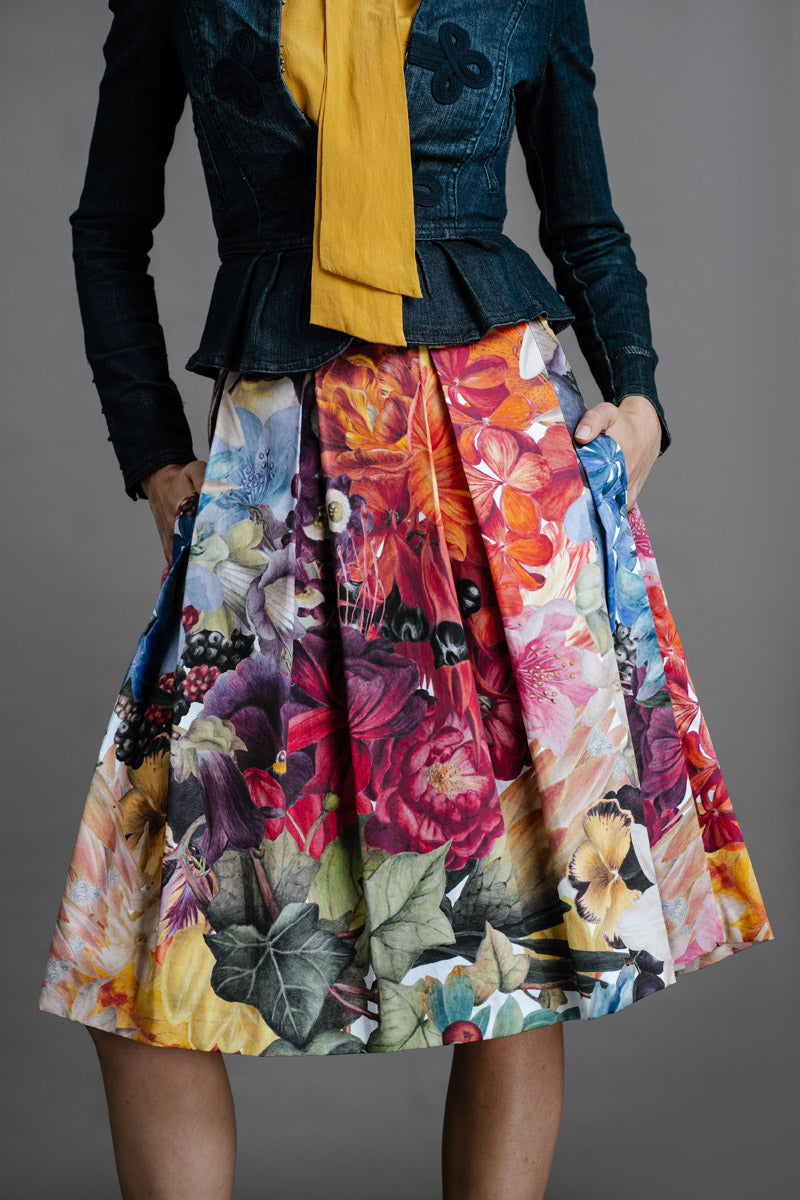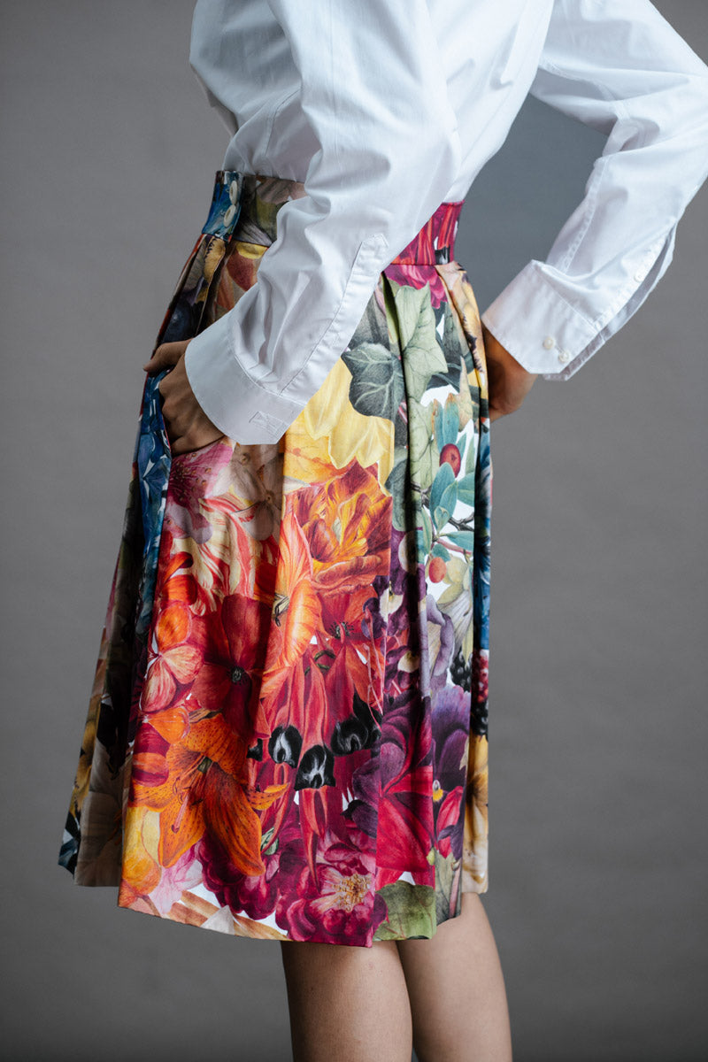 This head-turning floral, zero waste skirt features a wide waistband with a full, box pleat silhouette and deep, generous pockets — roomy enough to hold just about everything you might need for a night out.