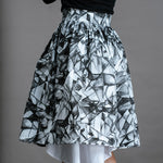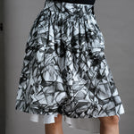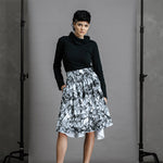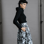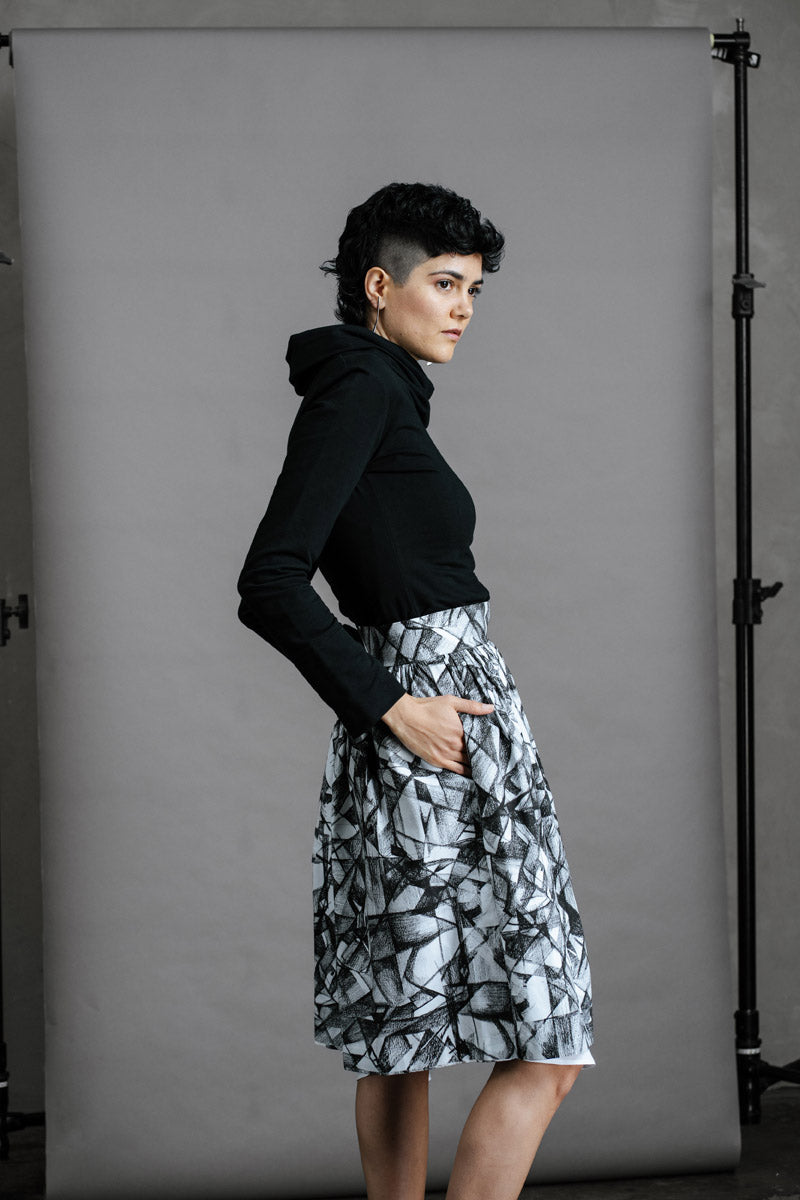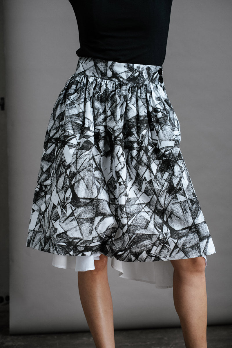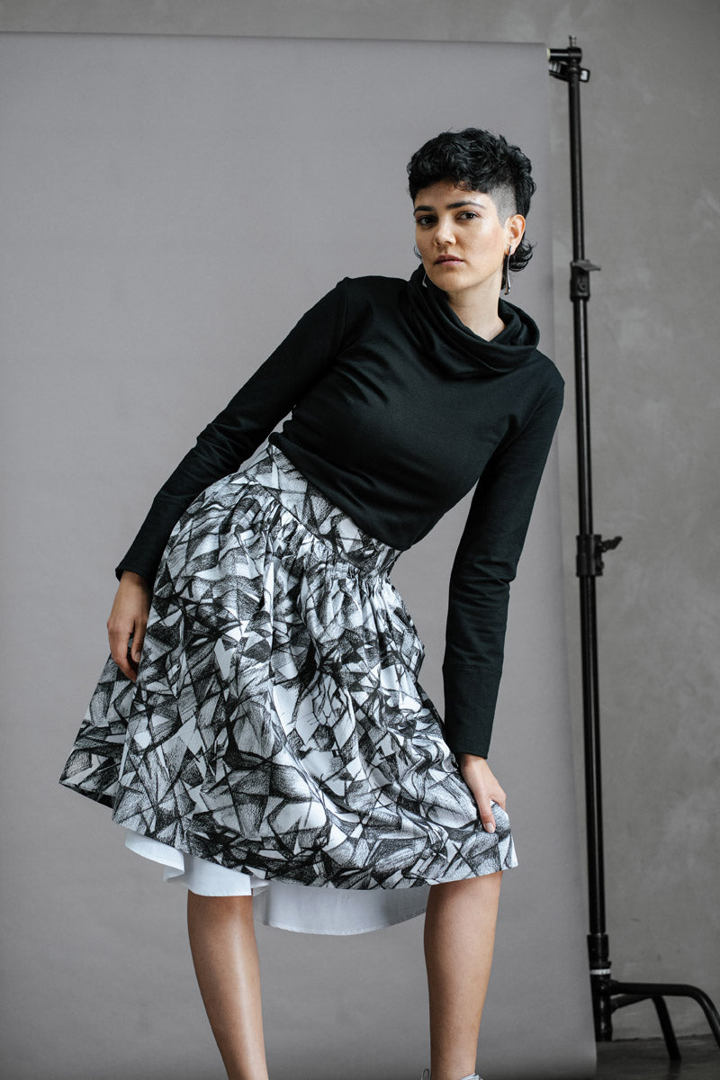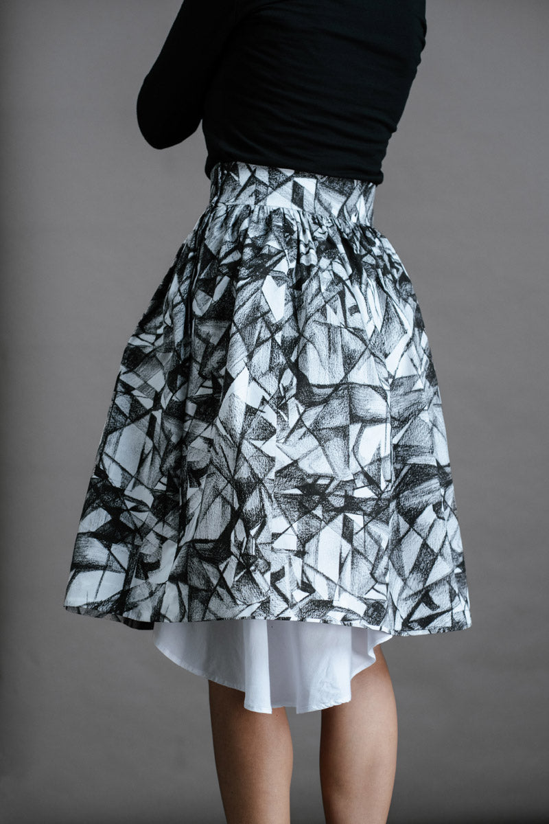 The Hiding Hares Zero Waste Skirt is playful elegance in black and white. The geometric print works with everything in your wardrobe, but look closer and you'll spot three hidden hare faces skilfully hidden in the design - a little secret for those paying attention.